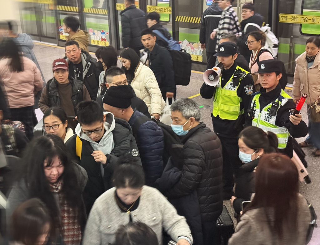 凌晨一点的时候,松江站那里,两千余个座位全都有人坐着,没有空的。永丰派出所的民警,在周边持续不断地进行巡逻,一旦看到行李比较多的旅客,就会走上前去帮一把。这里面有好多人是借助公共交通提前抵达站点来等车的,预计停留旅客的最高值会超过总客流的两成。
