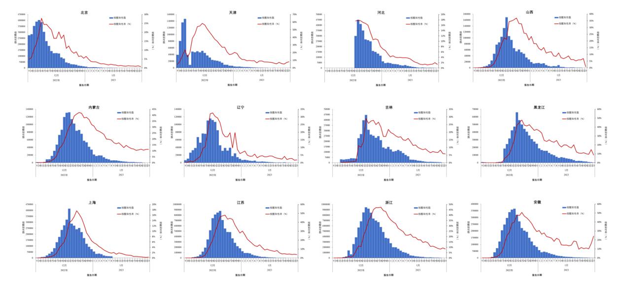 1月下旬之时,两项阳性率都已下降到6%以下,北京等城市达峰日子更早,北京在12月14日,天津于12月19日,这表明不同地区疫情进展有时间差异,不过整体走向高度相同。