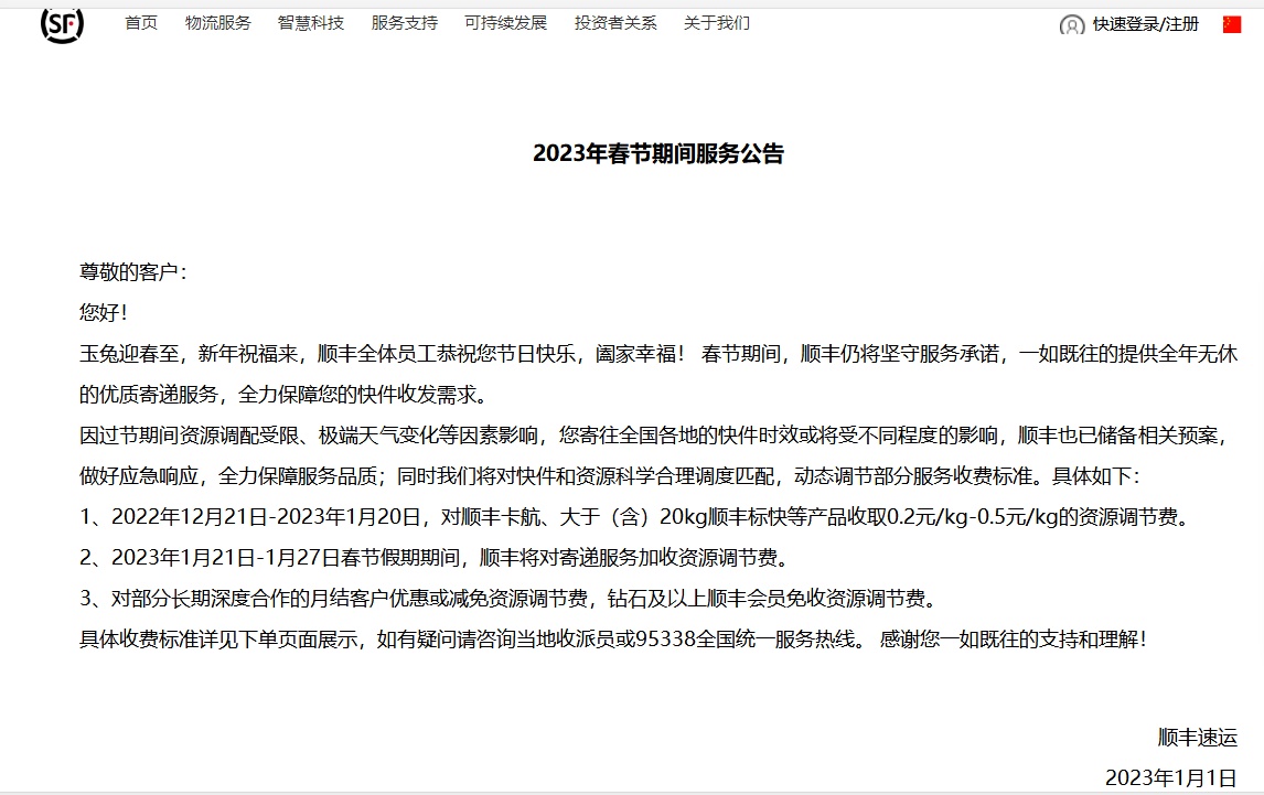 值得留意的是,春节期间的服务价格并非始终维持不变,在2022年12月21日至2023年1月20日这个时段,顺丰针对部分重货产品像是顺丰卡航、超过20kg的顺丰标快,会额外收取每公斤0.2元至0.5元的资源调节费。