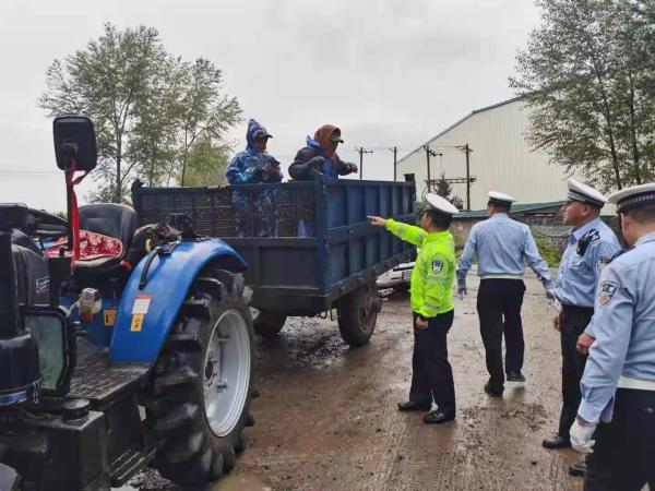 早晨7日5点半的时候,呼兰大队的交警在长康公路上冒着雨进行巡逻,发现有一台拖拉机,其后车厢里面站着两个人,由于车身不停摇晃,情形十分危险。更为揪心的是,当时雨在下着,同时路面是湿滑的状态。