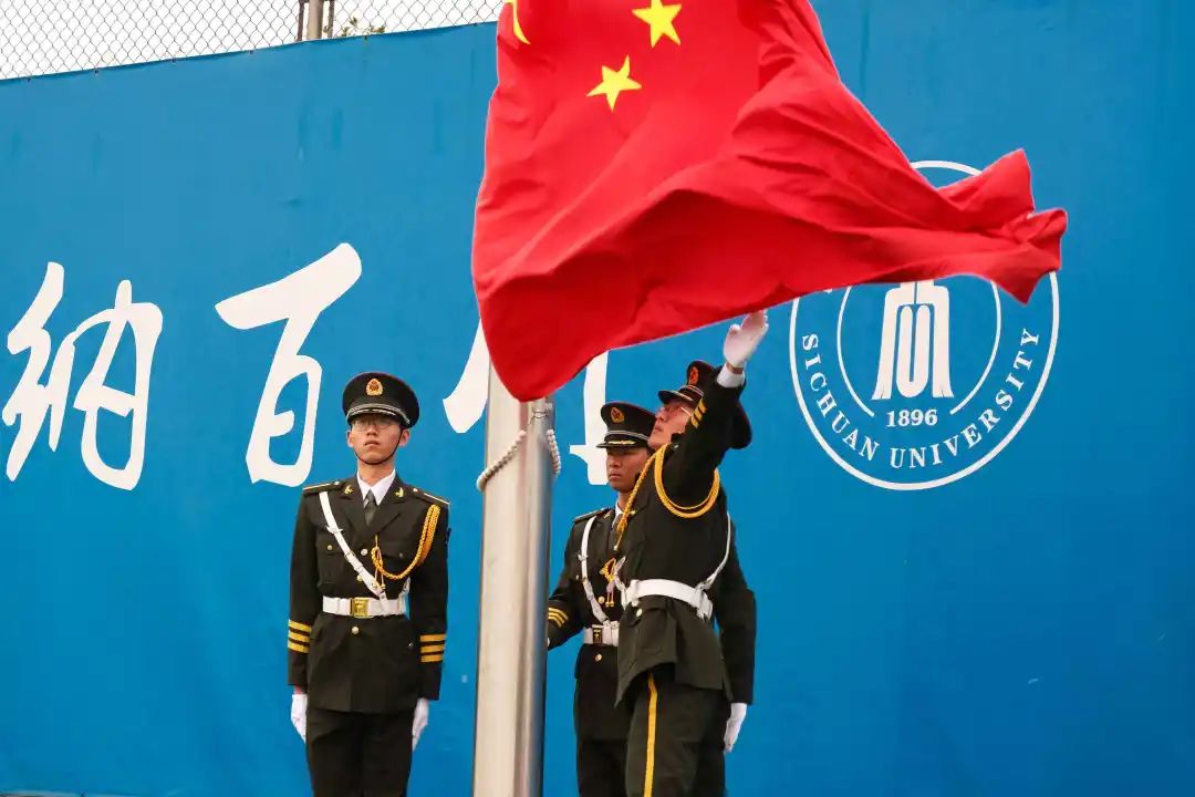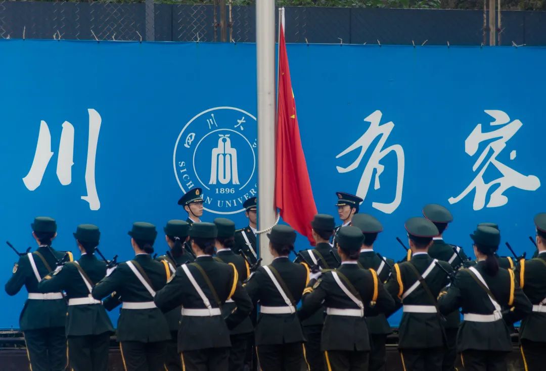 由国旗班护卫着的五星红旗,庄严地步步入场,全场的师生,全都肃穆站立,行着注目礼。各个学院的代表队,穿着统一的服装,陆续地入场,他们抖擞着精神,迈着整齐的步伐,把川大学子昂扬向上的精神风貌展现了出来。
