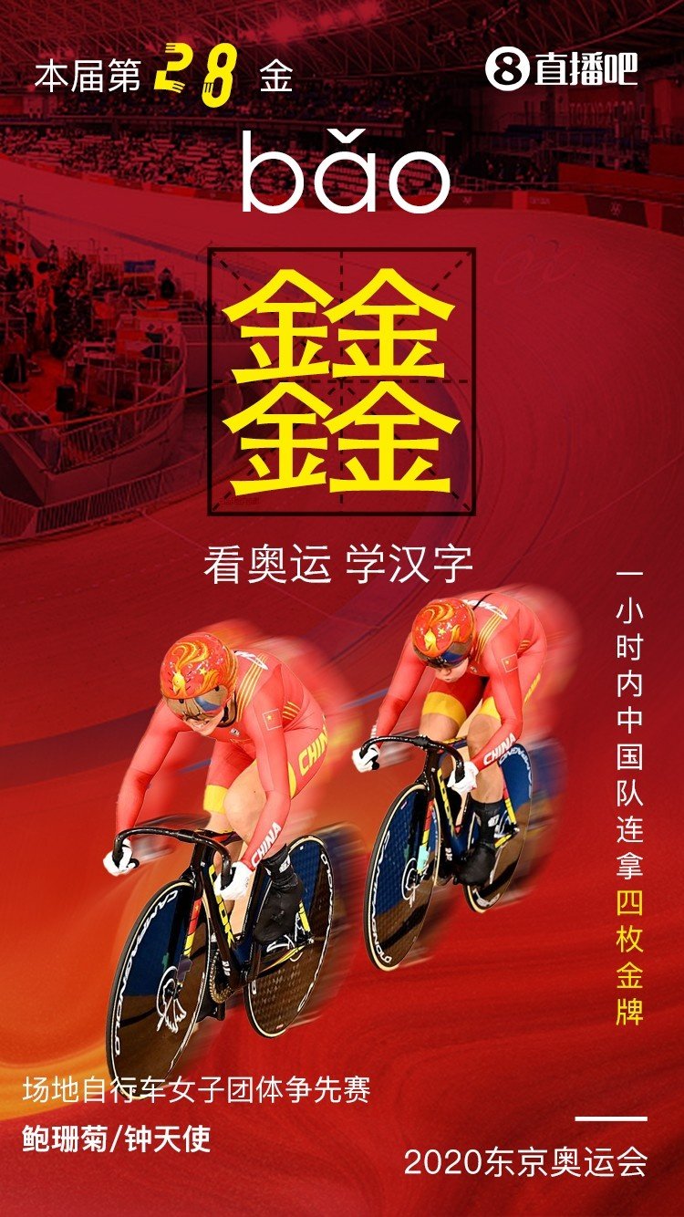场地自行车女子团体竞速赛取得夺金佳绩之后,海报文案运用了“鲍”这个字,此字一方面指代鲍珊菊自身,另一方面又精妙地凸显出在一小时之内中国队接连斩获四金所展现出的爆发力,并且还隐含着我国那些优秀选手好似珍宝一样接连不断涌现的意思,一张海报同时承载了时间、人物以及成绩这三层信息。