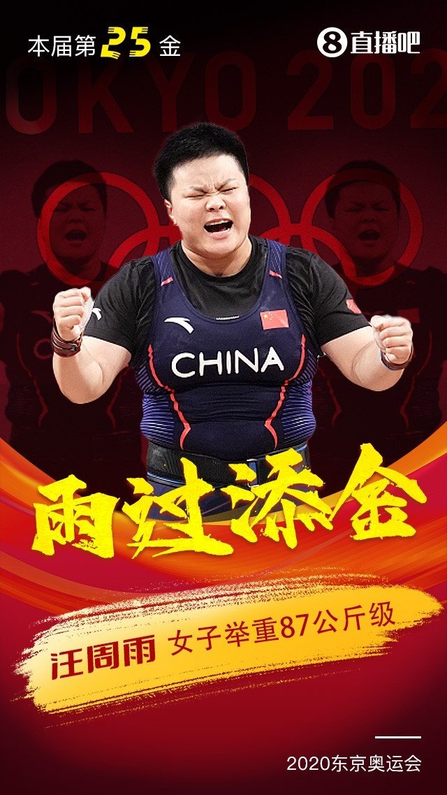 比赛里,女子举重87公斤级项目中,汪周雨成功夺冠,之后,“雨过添金”一词,直接嵌入了她的名字当中,与此同时,此词语还描绘出了举重选手,一举而过的那一瞬间,这个谐音,既交代了该项目特有的特点,又形象生动地表达出了,为中国代表团再增添一枚金牌的含义,并且,其画面感以及信息量,都极为充足。