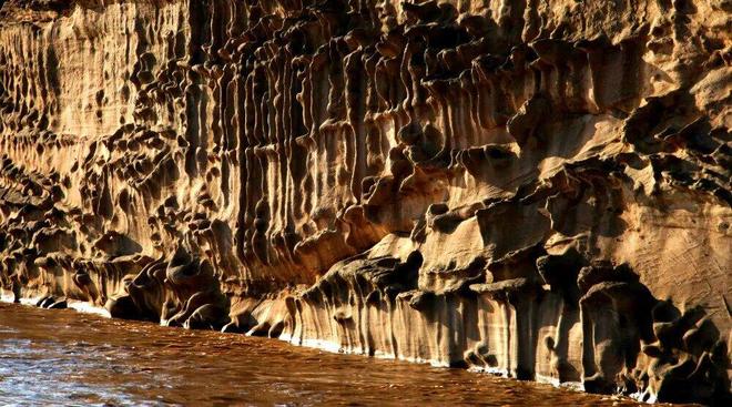当地人称黄河东岸的崖壁上一片奇观为“黄河浮雕”,其凹凸起伏,形态各不相同,那片奇观的物质基础是远古时期形成的砂岩与泥岩互层,其中砂岩坚硬得如同铁板,泥岩却相对较为松软,如此这般为差异侵蚀搭建好了舞台。