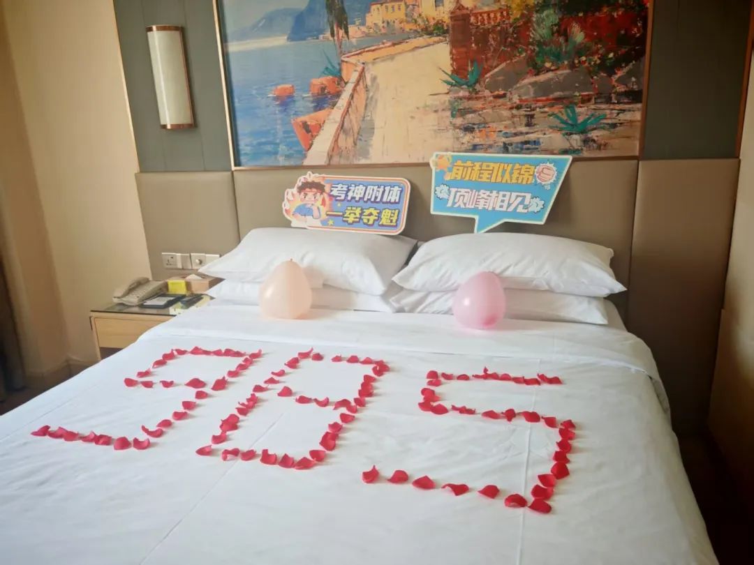 还有更巧妙的,有“211”“985”等定制房号,有金榜题名地垫,还有大堂公共区域醒目的励志标语。这些设计精准地击中了考生以及家长对于好彩头的心理期待。酒店不再仅仅是提供住宿,而是成为了考生“心理备战”极为重要的一环。